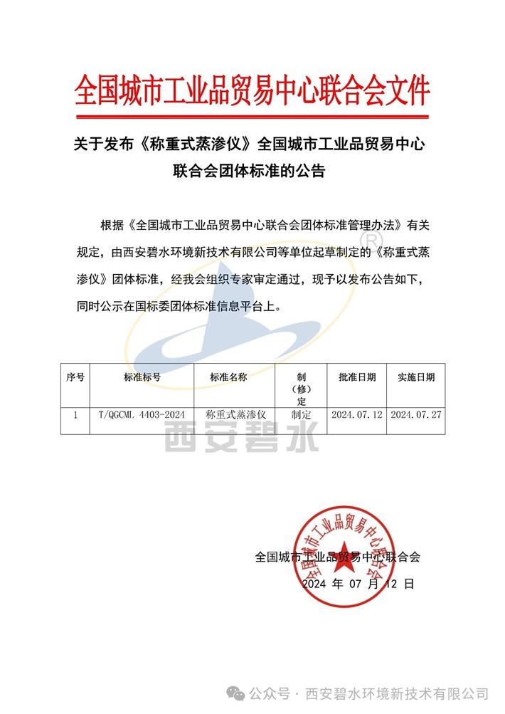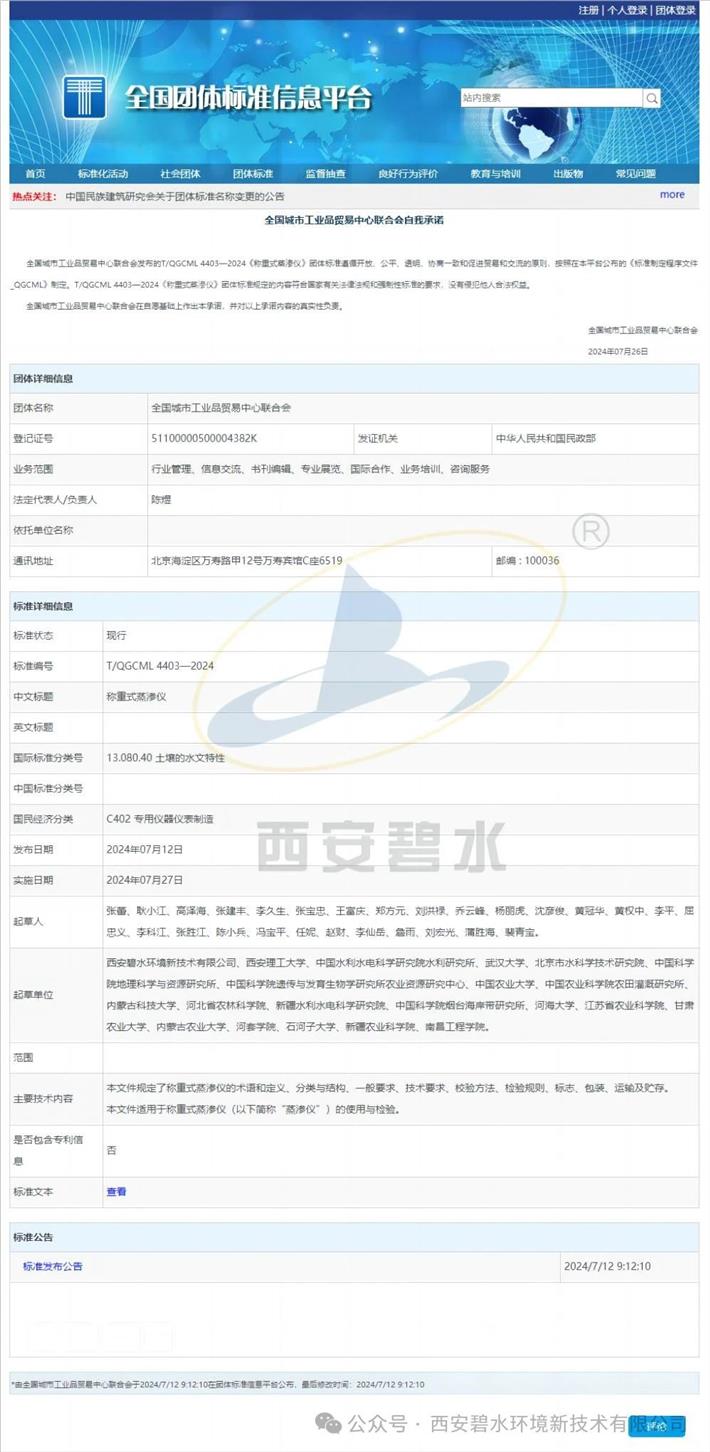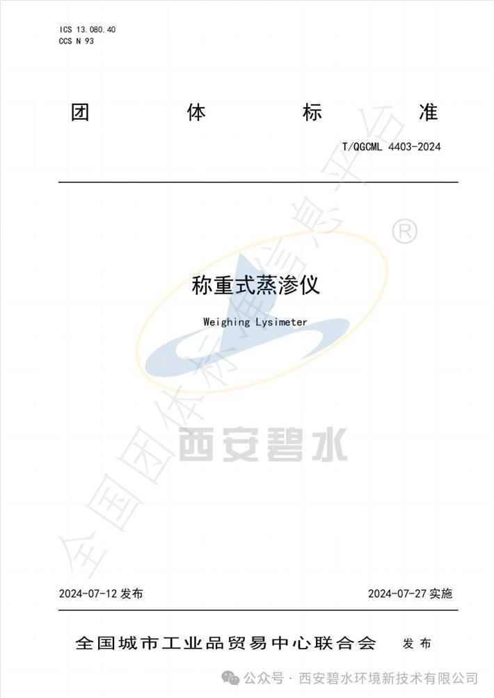 我公司与西安理工大学、中国水利水电科学研究院水利研究所、武汉大学、北京市水科学技术研究院、中国科学院地理科学与资源研究所、中国科学院遗传与发育生物学研究所农业资源研究中心、中国农业大学、中国农业科学院农田灌溉研究所、内蒙古科技大学、河北省农林科学院、新疆水利水电科学研究院、中国科学院烟台海岸带研究所、河海大学、江苏省农业科学院、甘肃农业大学、内蒙古农业大学、河套学院、石河子大学、新疆农业科学院、南昌工程学院共同起草制定的关于《称重式蒸渗仪》(T/QGCML 4403—2024)团体标准经由全国城市工业品贸易中心联合会审定通过,于2024年7月12日发布,并于2024年7月27日起开始实施。