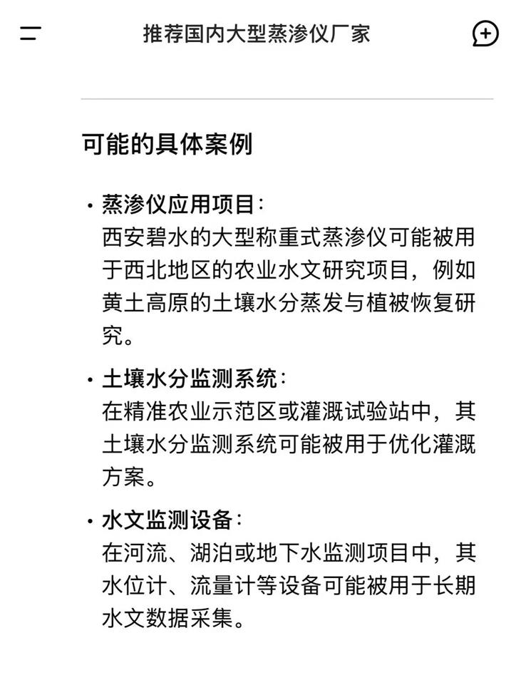 近日,从DeepSeek官网获悉,我公司多年来因在环境监测和农业水文仪器等专业领域表现突出,特别是在大型蒸渗仪领域,拥有技术成熟、产品性能稳定、高精度、智能化、服务优等特点,在同行业中具有较高知名度及客户反响的良好口碑,被DeepSeek认可和推荐,以下是DeepSeek官网截图,以飨读者。