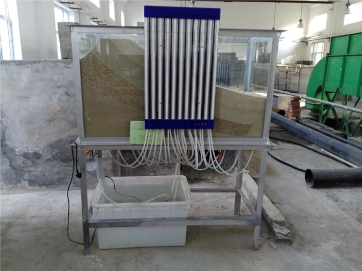 承压水模拟演示仪为方形钢结构框架,框架内装填石英砂制作包含承压水层的模拟地形,装置还包含外部补给河道、承压水完整井非完整井、测压管、模拟抽水控制阀门等。